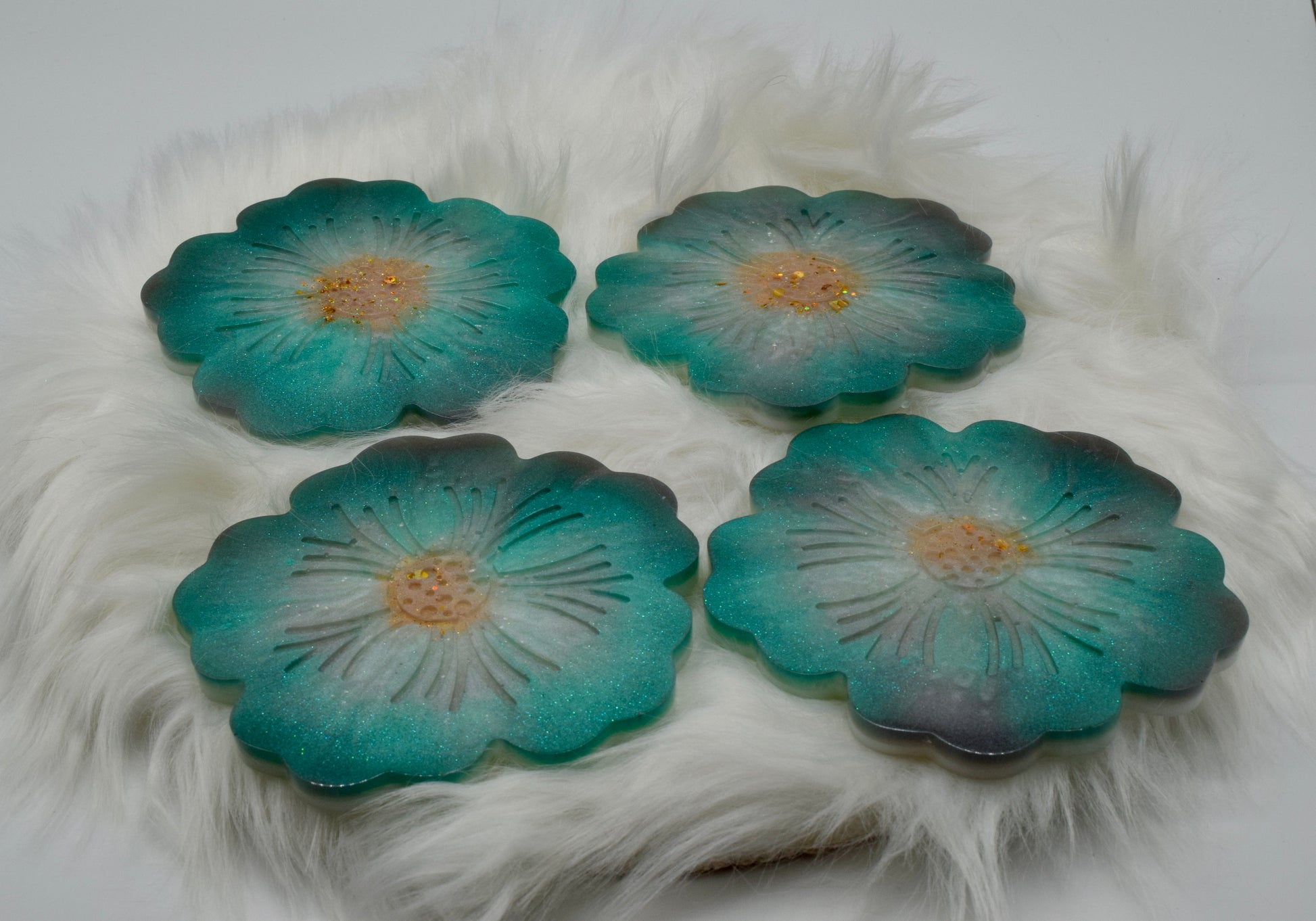Blumen-Untersetzer aus Epoxidharz – 4er Set in Türkis, Grau & Gold – Handgefertigte Glitzer-Tischdeko