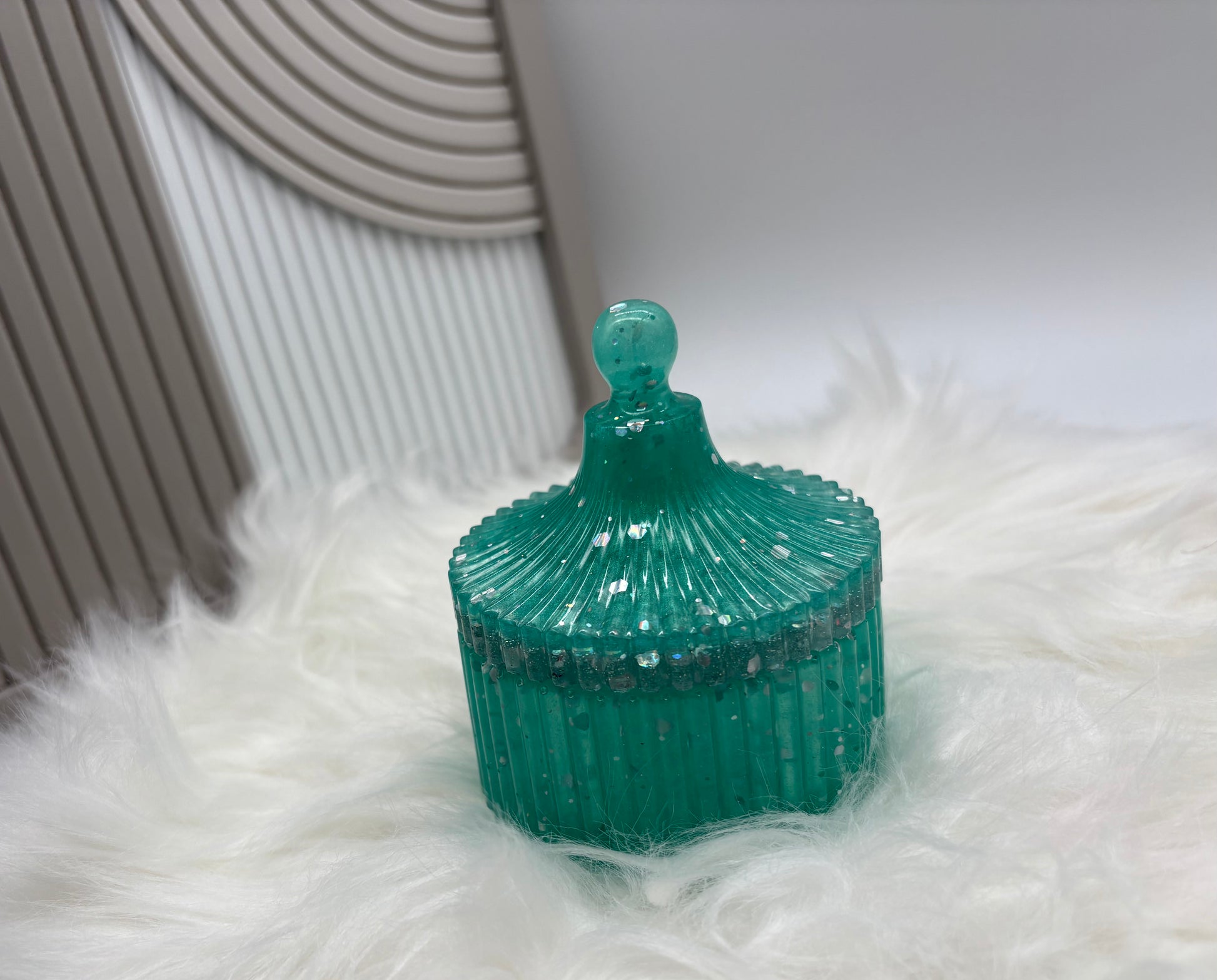 Diese handgemachte Resin-Dose mit Deckel vereint Eleganz und Funktionalität. Das smaragdgrüne Design mit funkelnden Glitzerakzenten macht sie zu einem echten Highlight in jedem Raum – ob als Schmuckdose, kleine Aufbewahrung oder dekoratives Element.