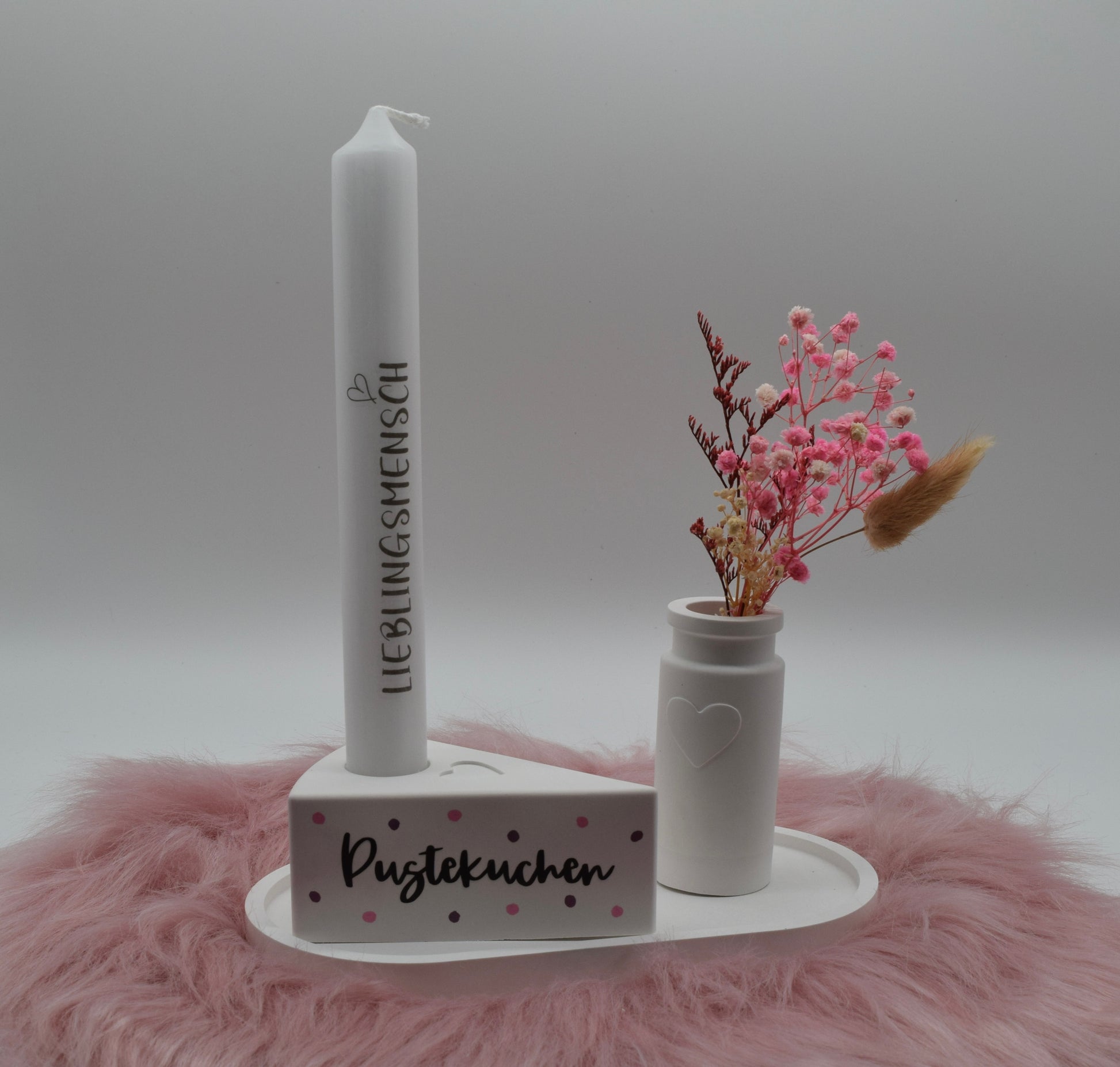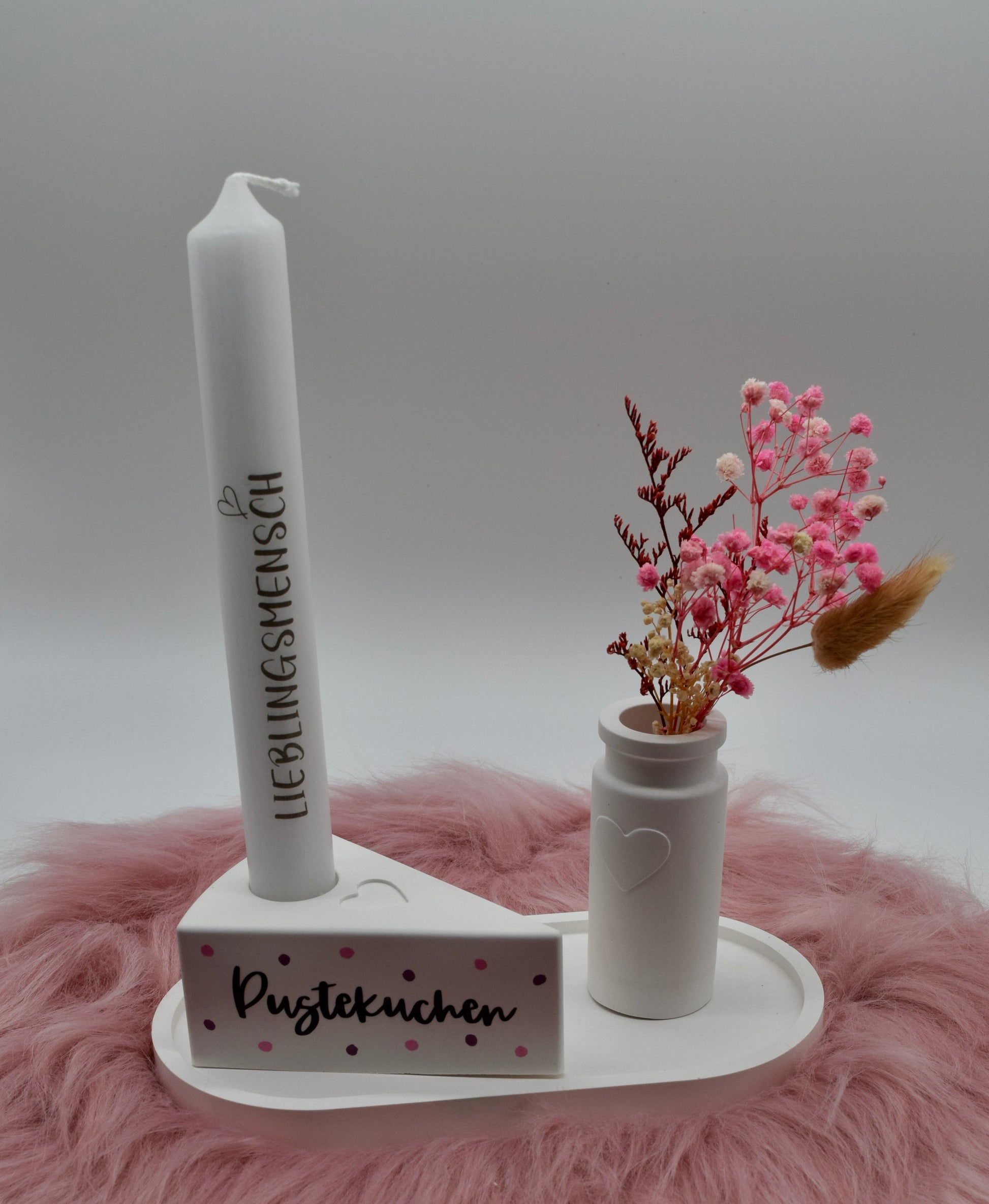 Dieses liebevoll gestaltete Deko-Set ist das perfekte Geschenk für deinen Lieblingsmenschen – charmant, verspielt und handgefertigt. Das Highlight: ein Kerzenhalter in Kuchenstück-Form mit der Aufschrift „Pustekuchen“, kombiniert mit einer weißen Stabkerze „Lieblingsmensch“ und einer kleinen Vase voller zarter Trockenblumen.