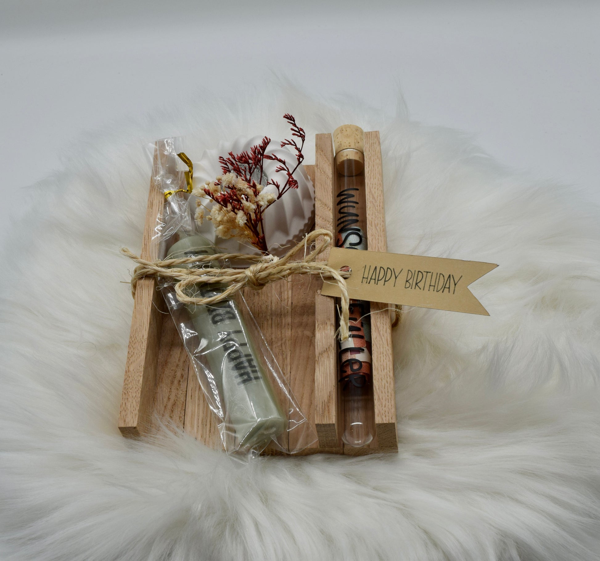Dieses handgefertigte Set ist die perfekte Überraschung für Geburtstage. Auf einem kleinen Holzbrett arrangiert, vereint es dekorative Elemente mit einer originellen Idee für Geldgeschenke.