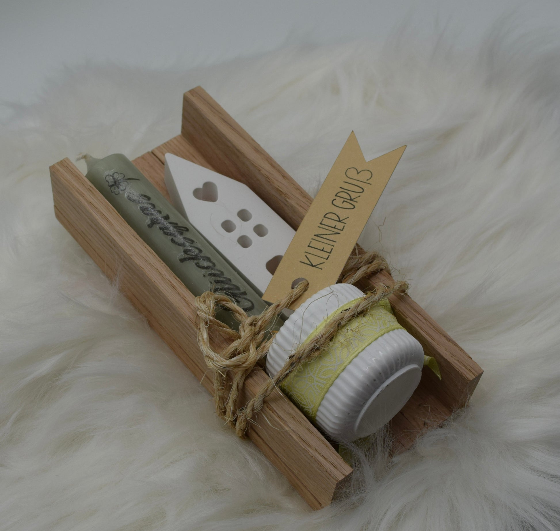 Handgemachtes Geschenkset "Kleiner Gruß" mit Kerze, Dekohaus, Kerzenhalter & Holztablett