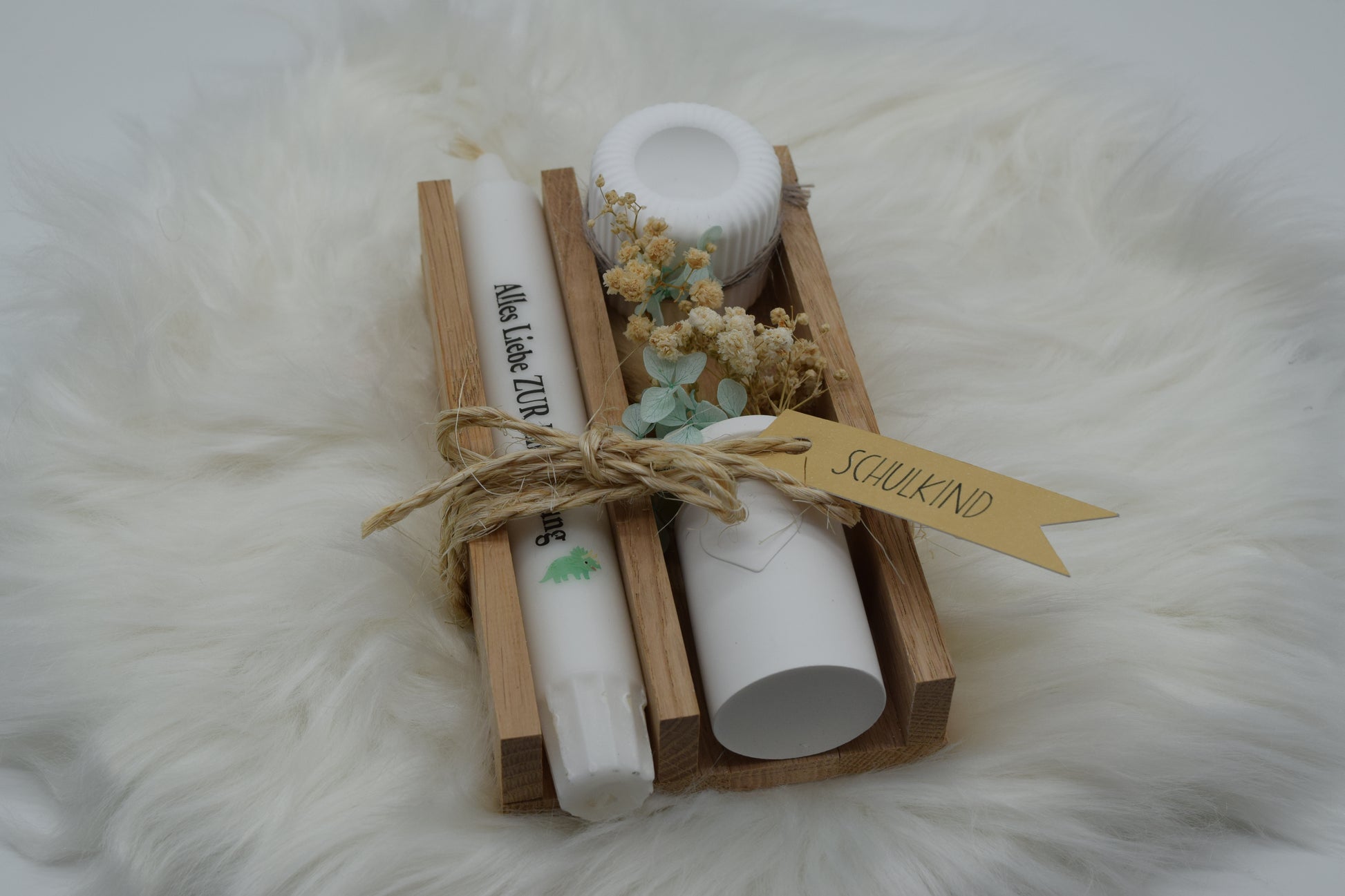 Handgemachtes Geschenkset zur Einschulung mit Kerze, Mini-Vase, Trockenblumen & Holztablett