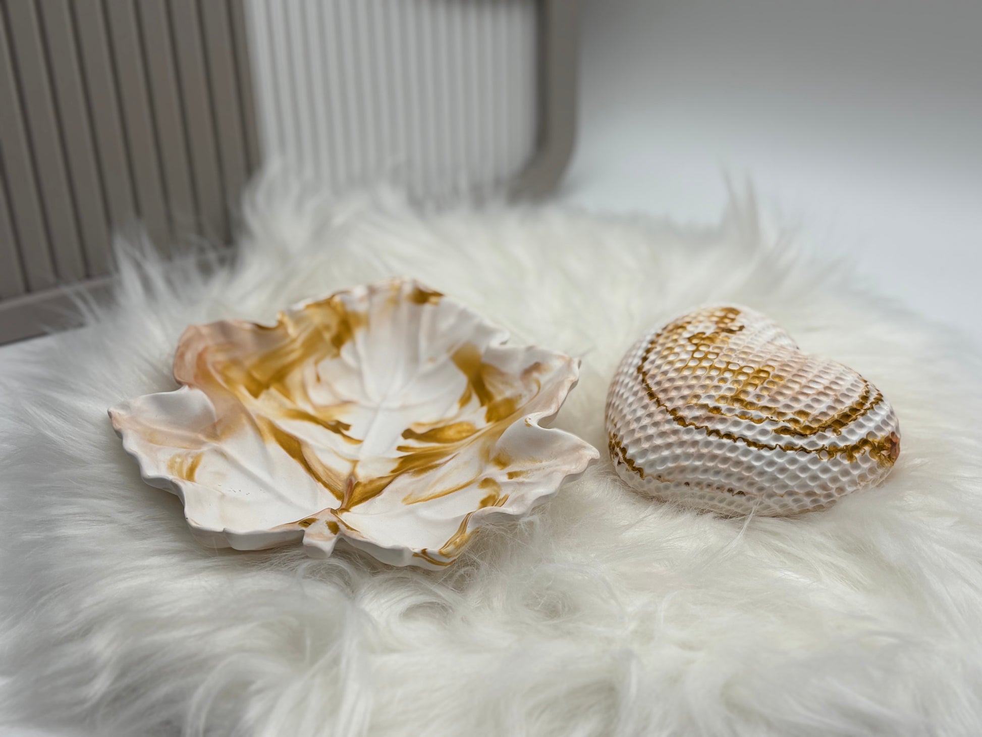 Die Blattschale eignet sich perfekt als Schmuck- oder Ablageschale für Kleinigkeiten, während das Herz ein stilvolles Dekoelement ist – ob auf dem Tisch, im Regal oder als kleines Geschenk.