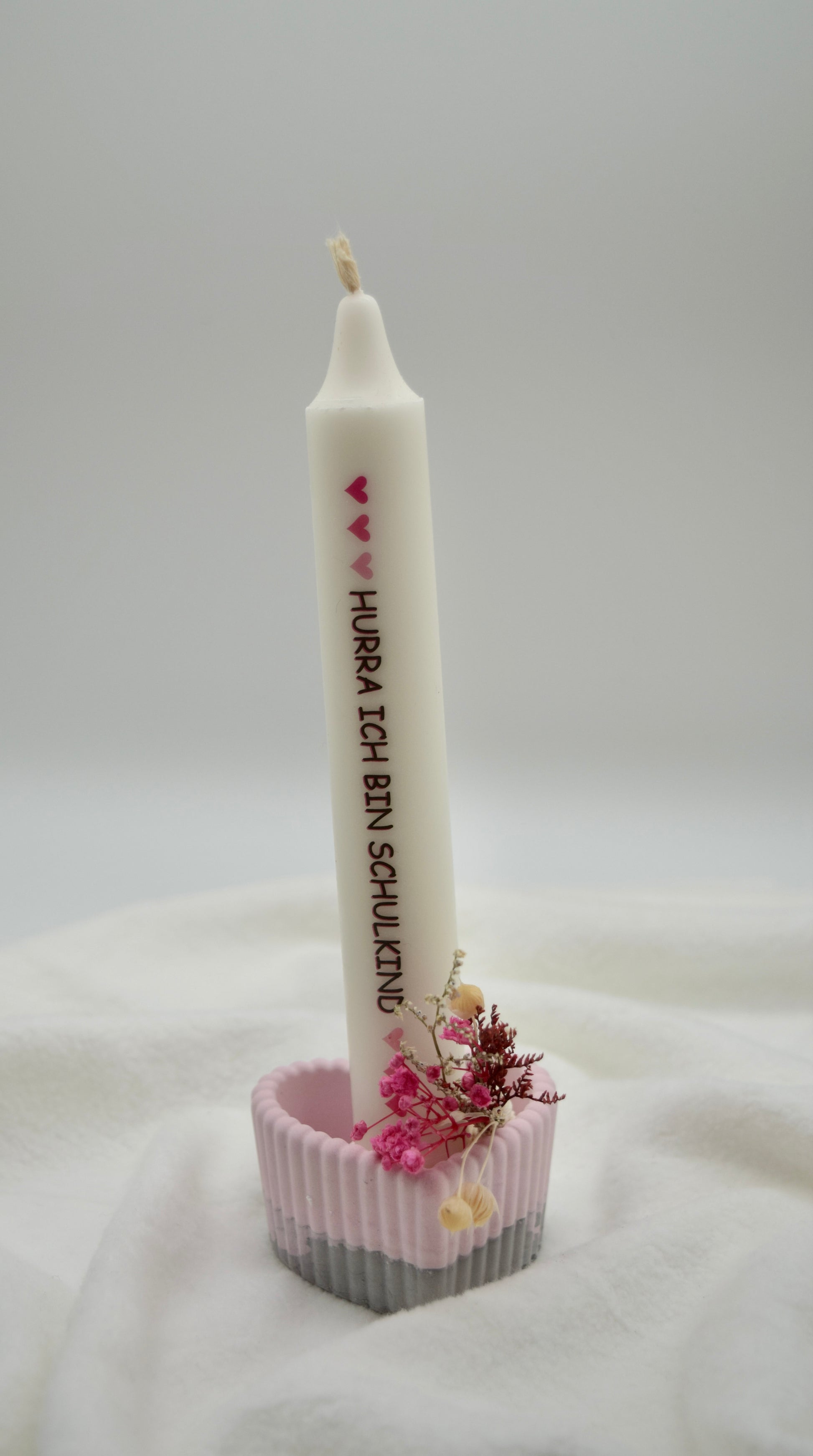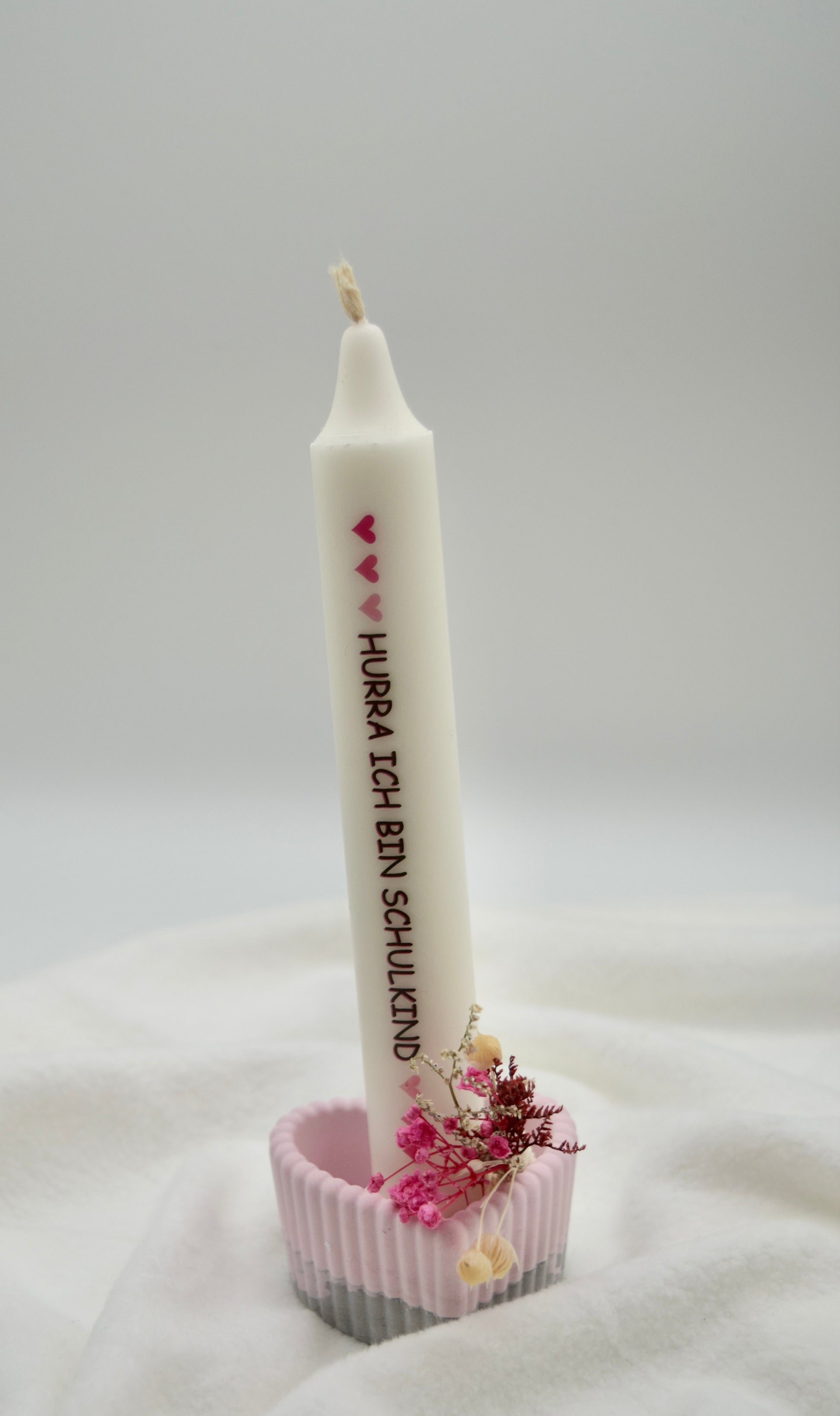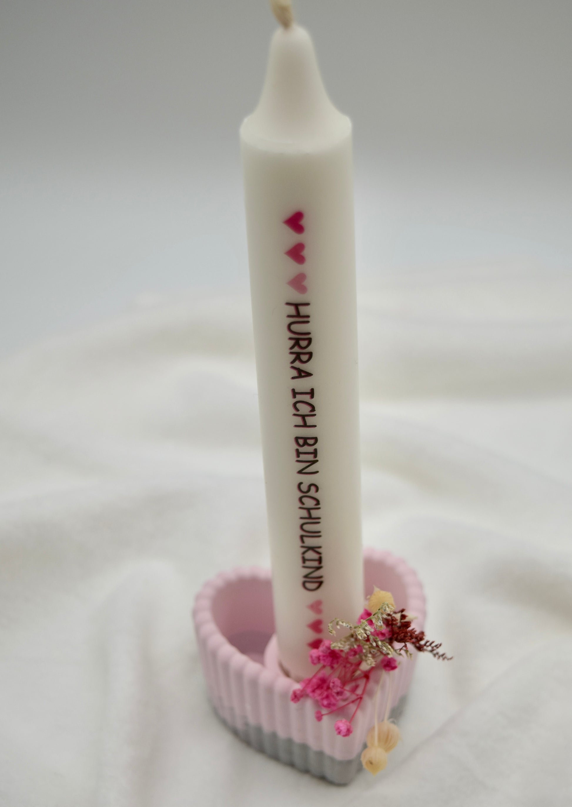 Kerze „Hurra ich bin Schulkind“ im Herzhalter – handgegossen & liebevoll verziert