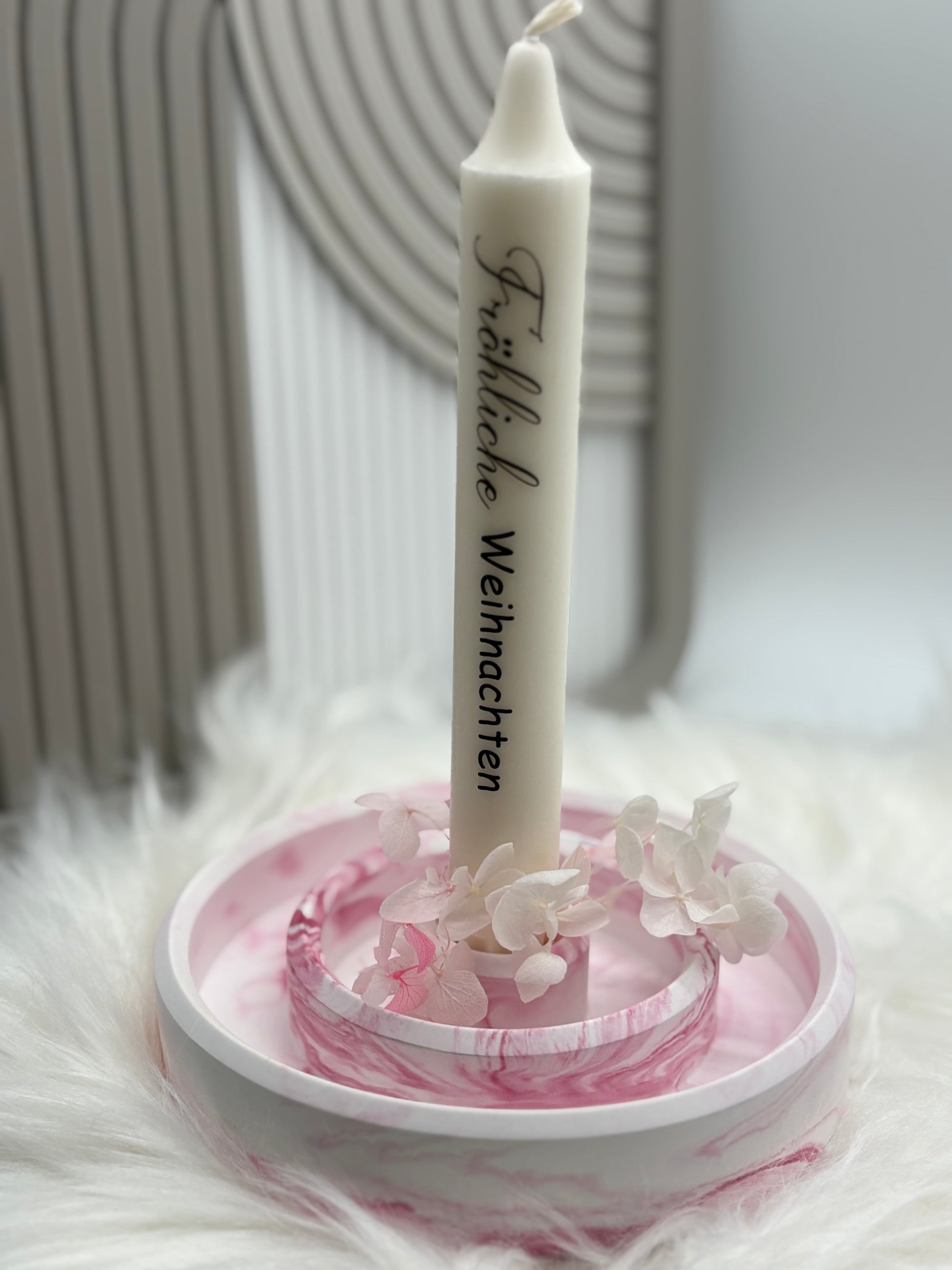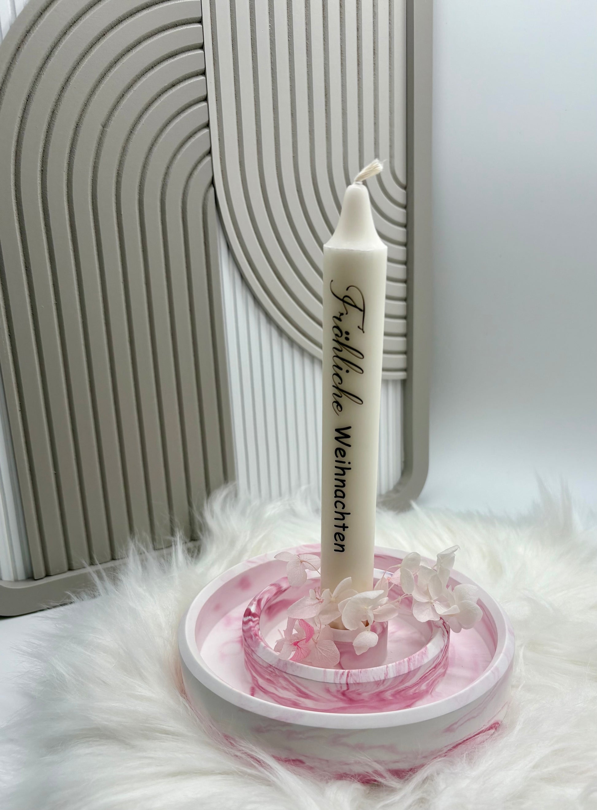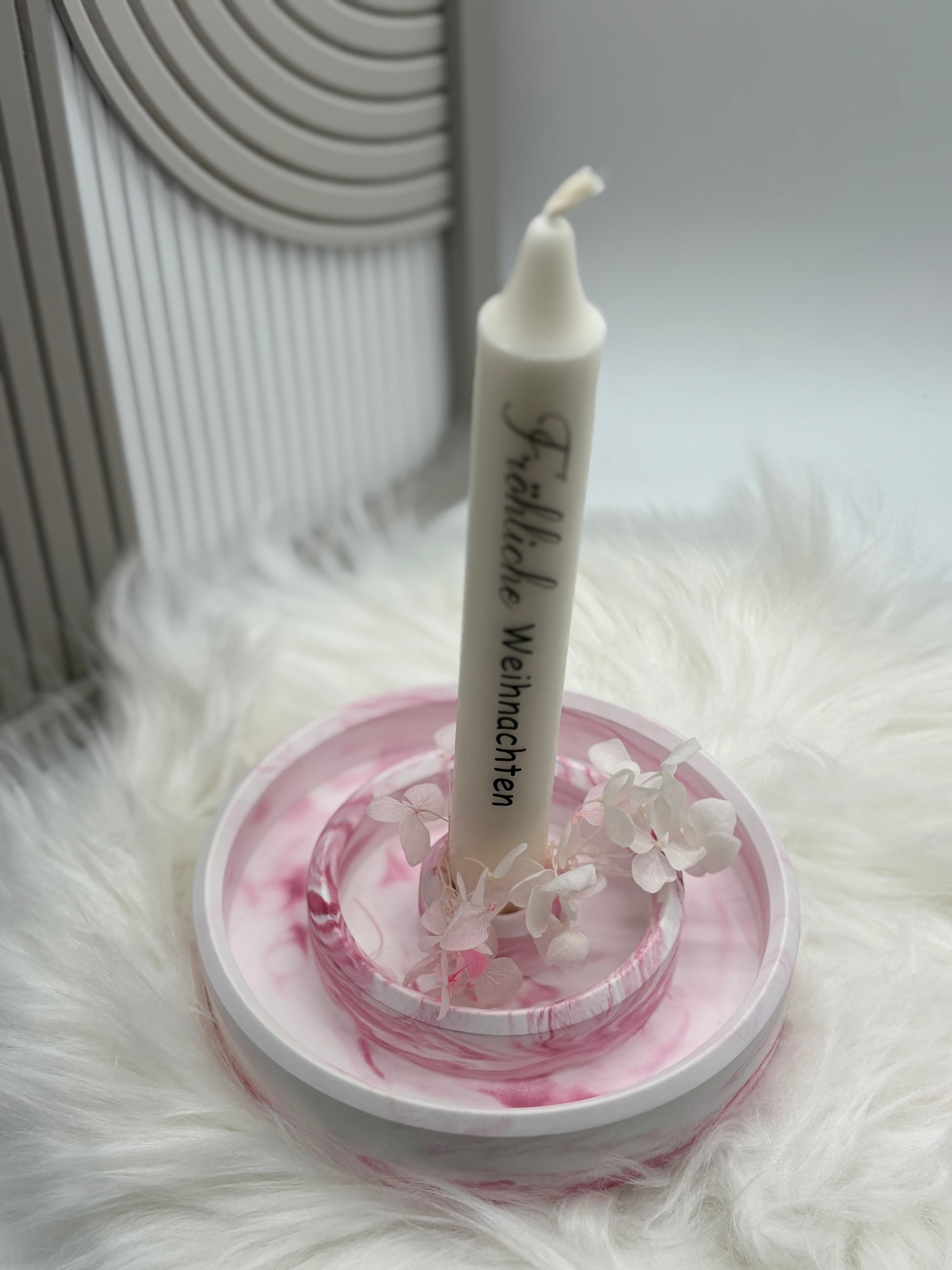 Der Kerzenhalter wird aus hochwertigem Gießpulver gefertigt und mit rosa-weißen Marmor-Akzenten gestaltet. Zarte Trockenblüten runden das Design ab und verleihen deinem Zuhause eine festliche, warme Atmosphäre.