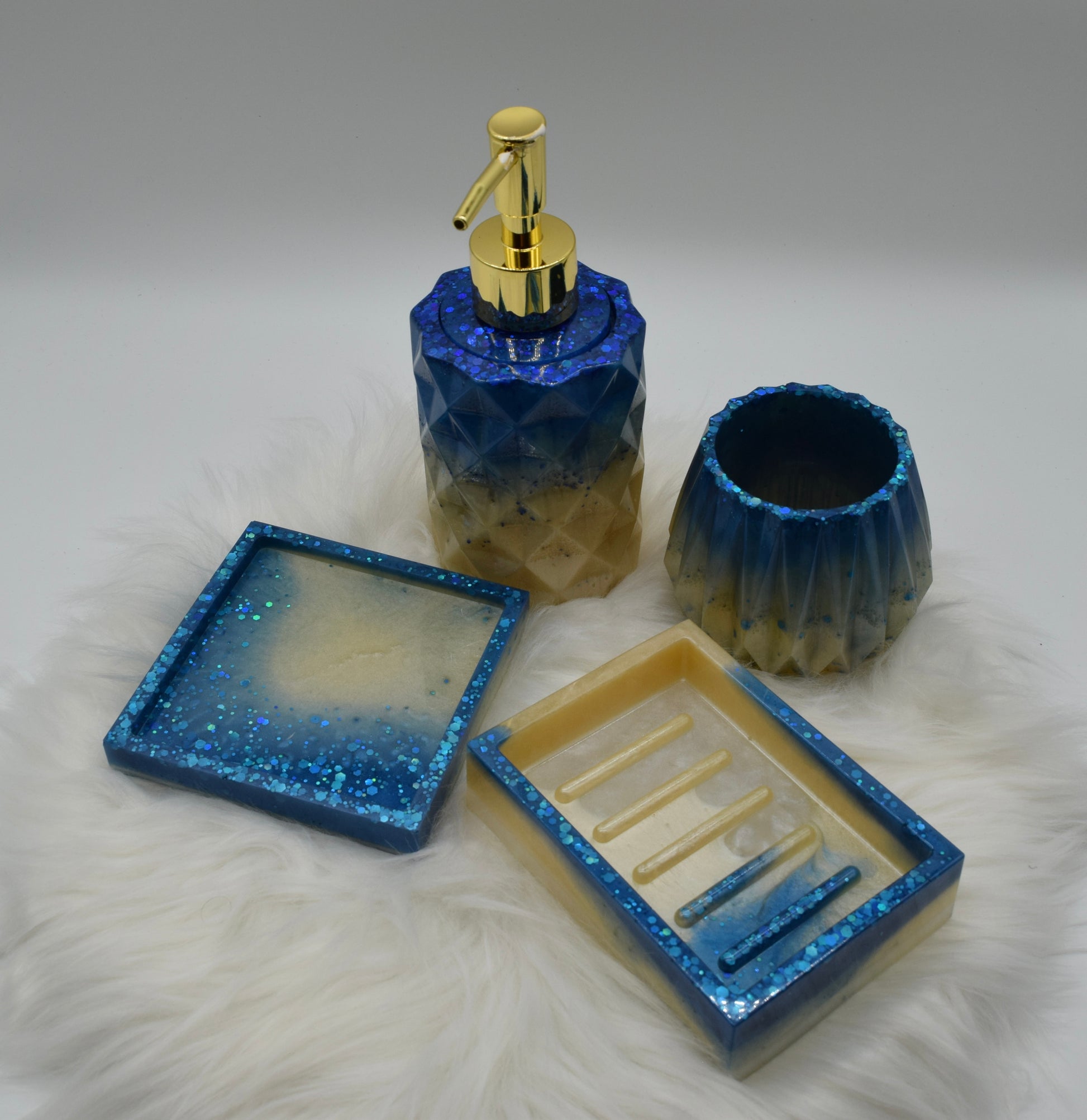 Luxuriöses 4-teiliges Bad-Set aus Epoxidharz in Nachtblau & Creme mit Glitzer. Handgemacht & einzigartig.