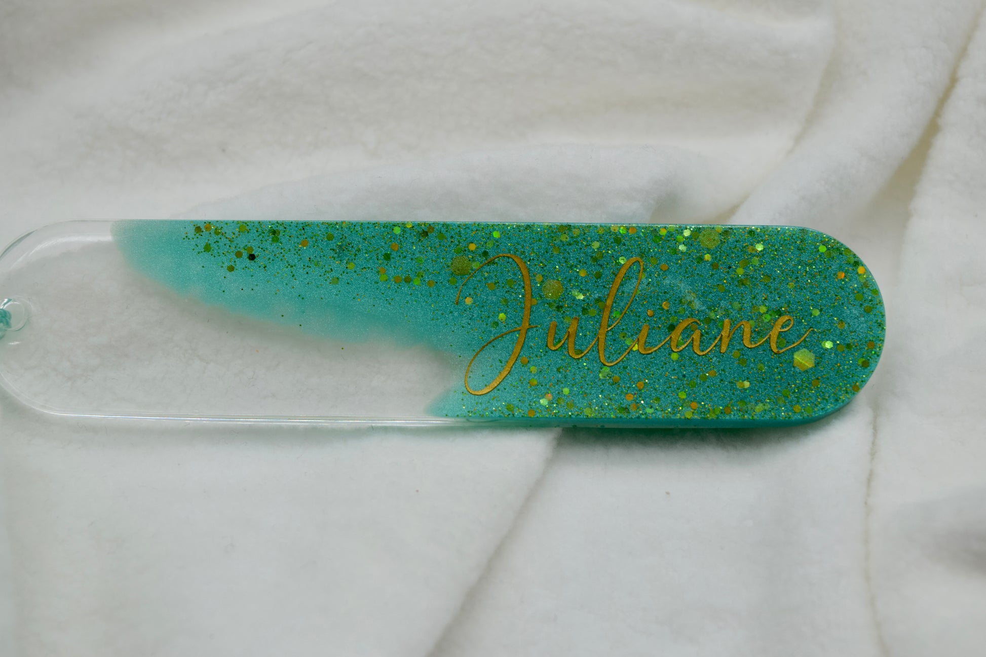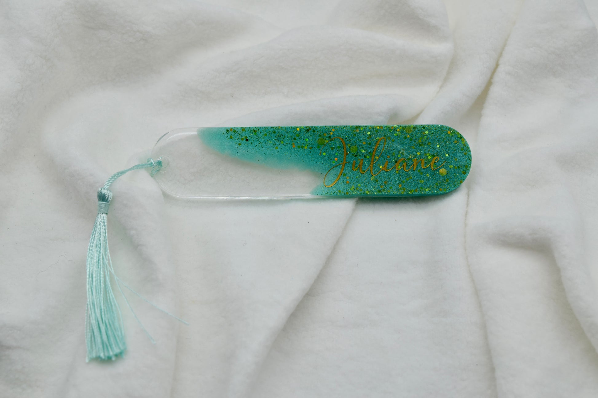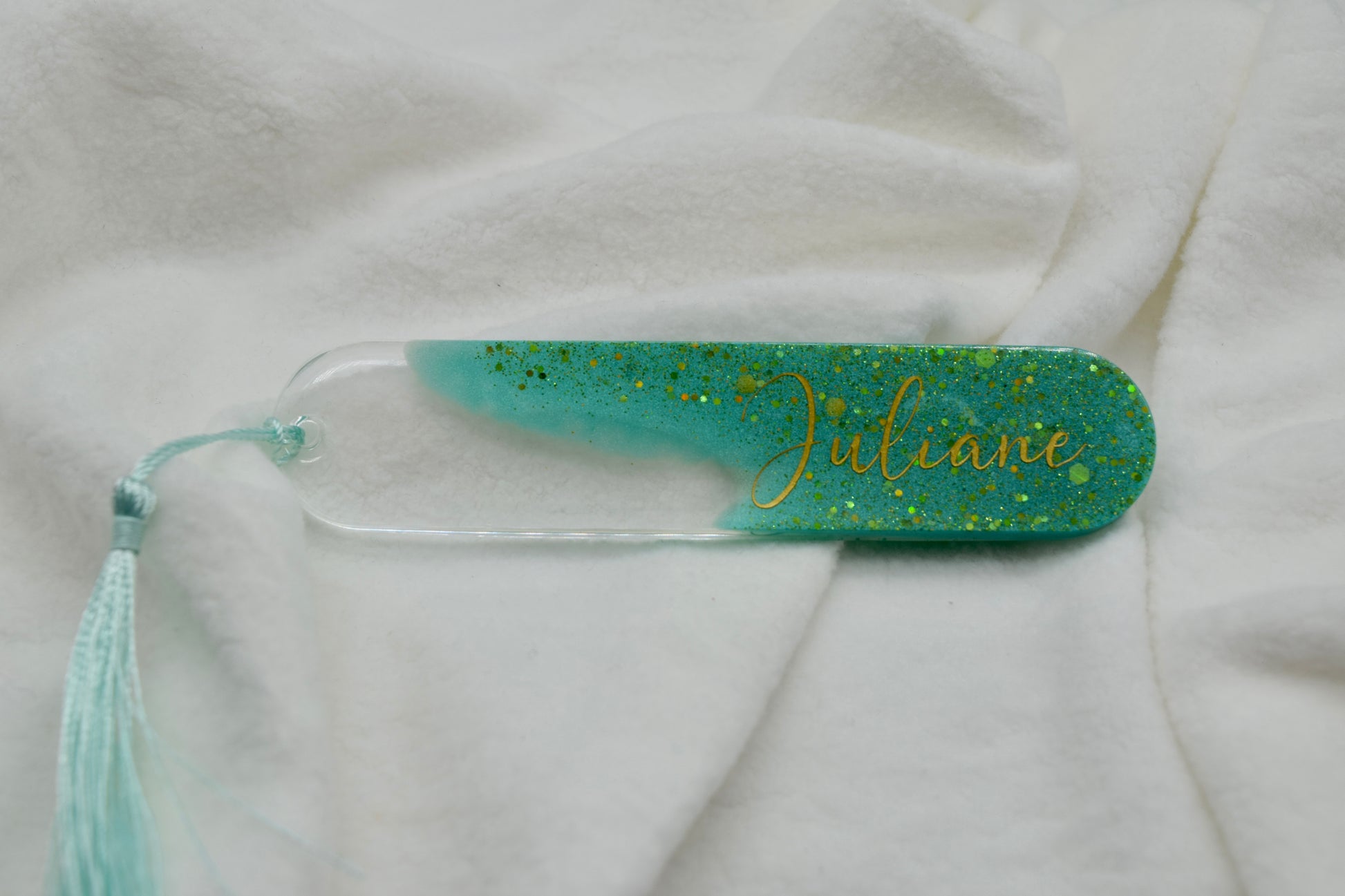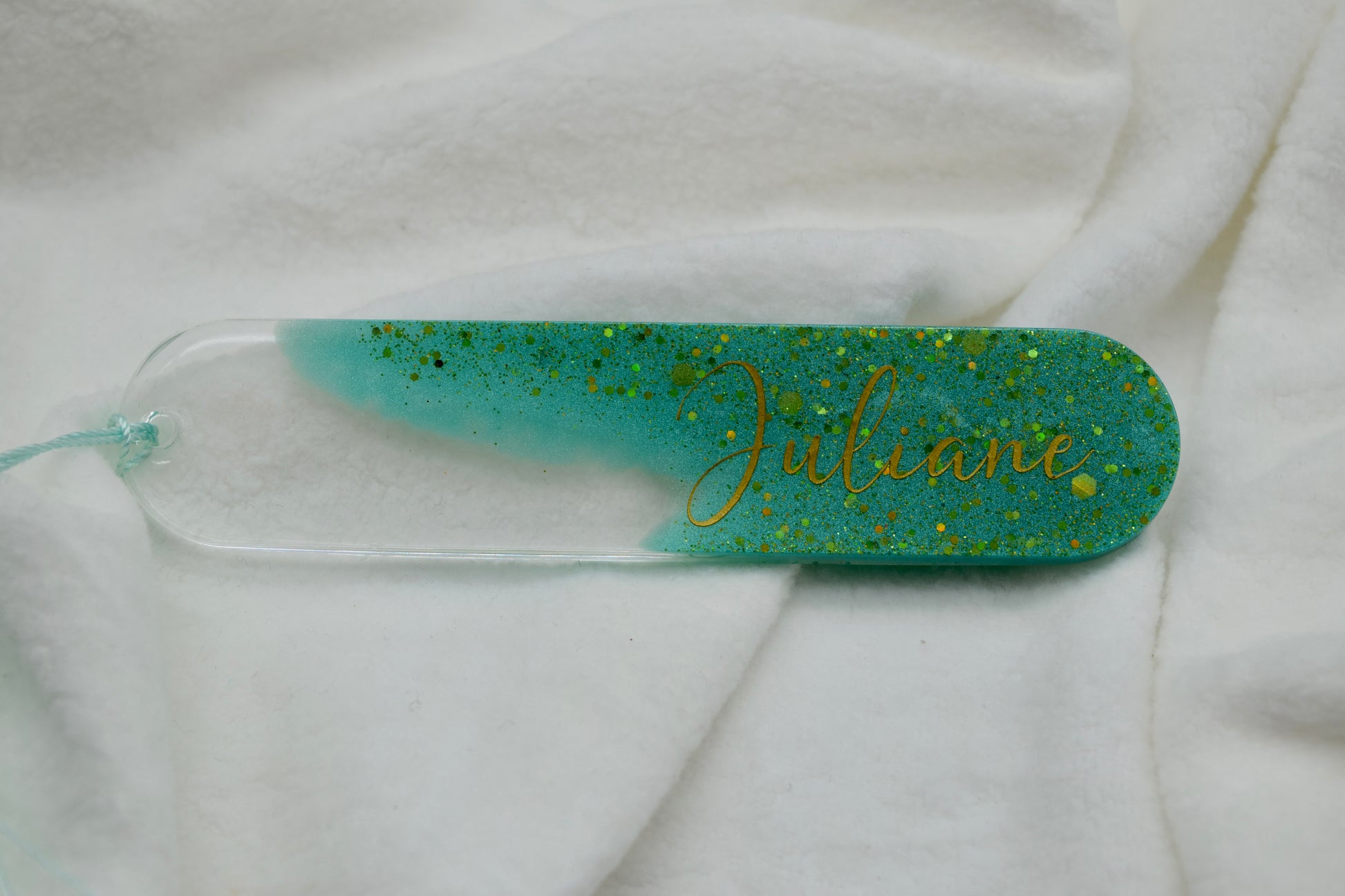 Personalisierbares Lesezeichen – Glitzer Türkis mit Namen personalisierbar – Handgegossen