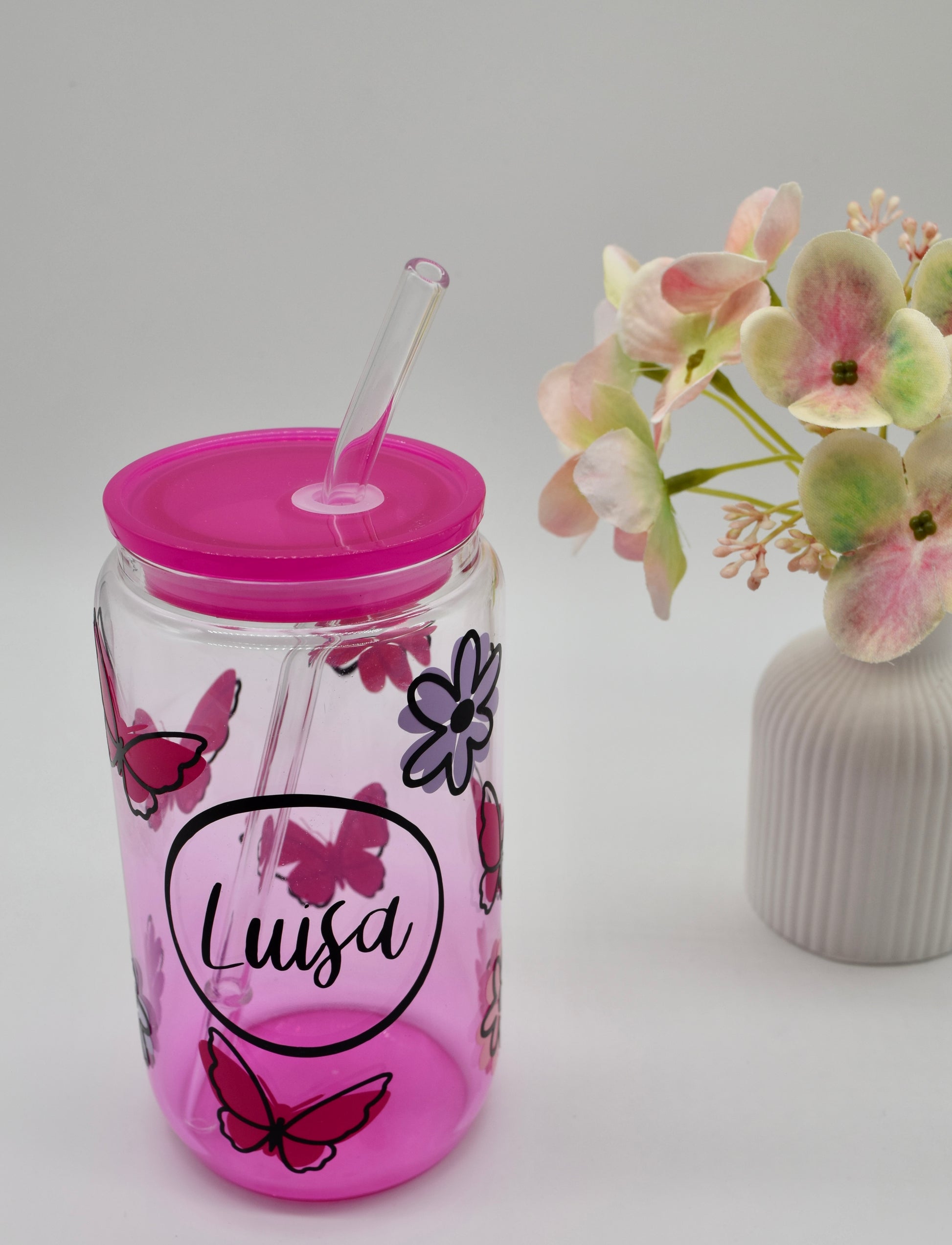 Personalisierter Kinderbecher – Schmetterlinge & Blumen – Pink – Glas mit Deckel & Strohhalm – mit Wunschname