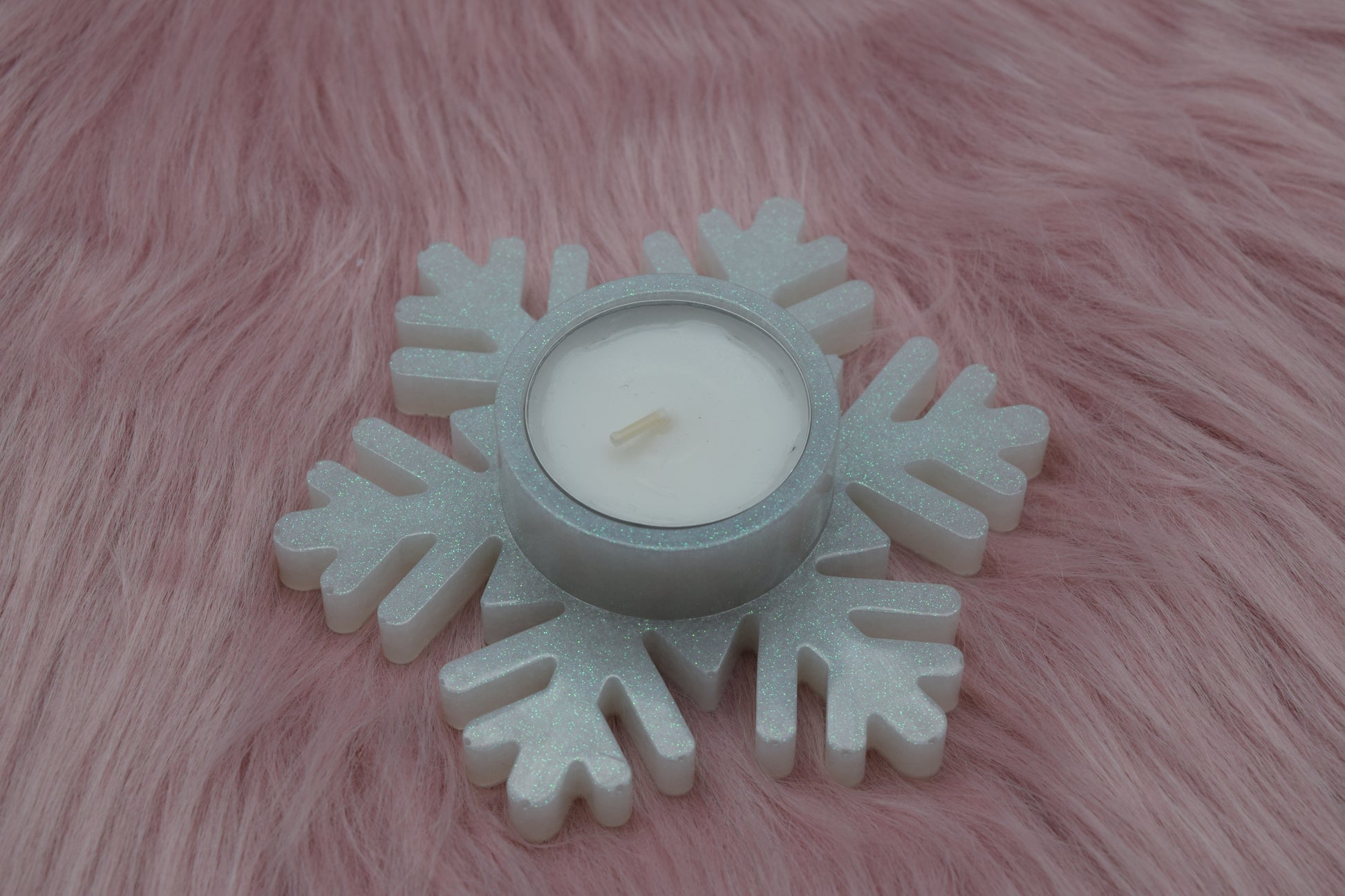 Dieser handgefertigte Teelichthalter in Schneeflockenform aus Epoxidharz bringt zauberhaftes Licht und gemütliche Stimmung in die kalte Jahreszeit.