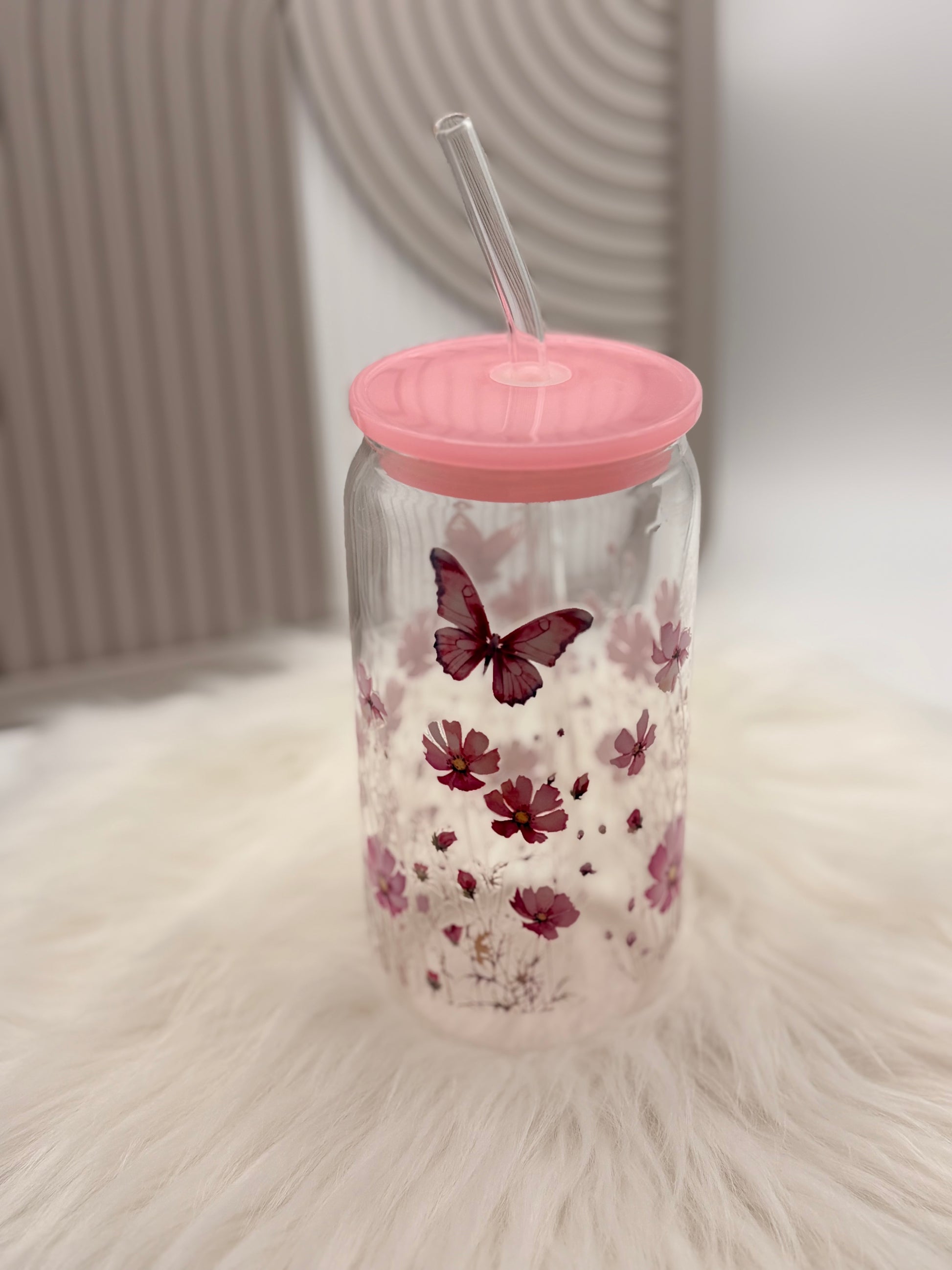 Trinkglas mit Deckel & Strohhalm - Blumen und Schmetterling Design