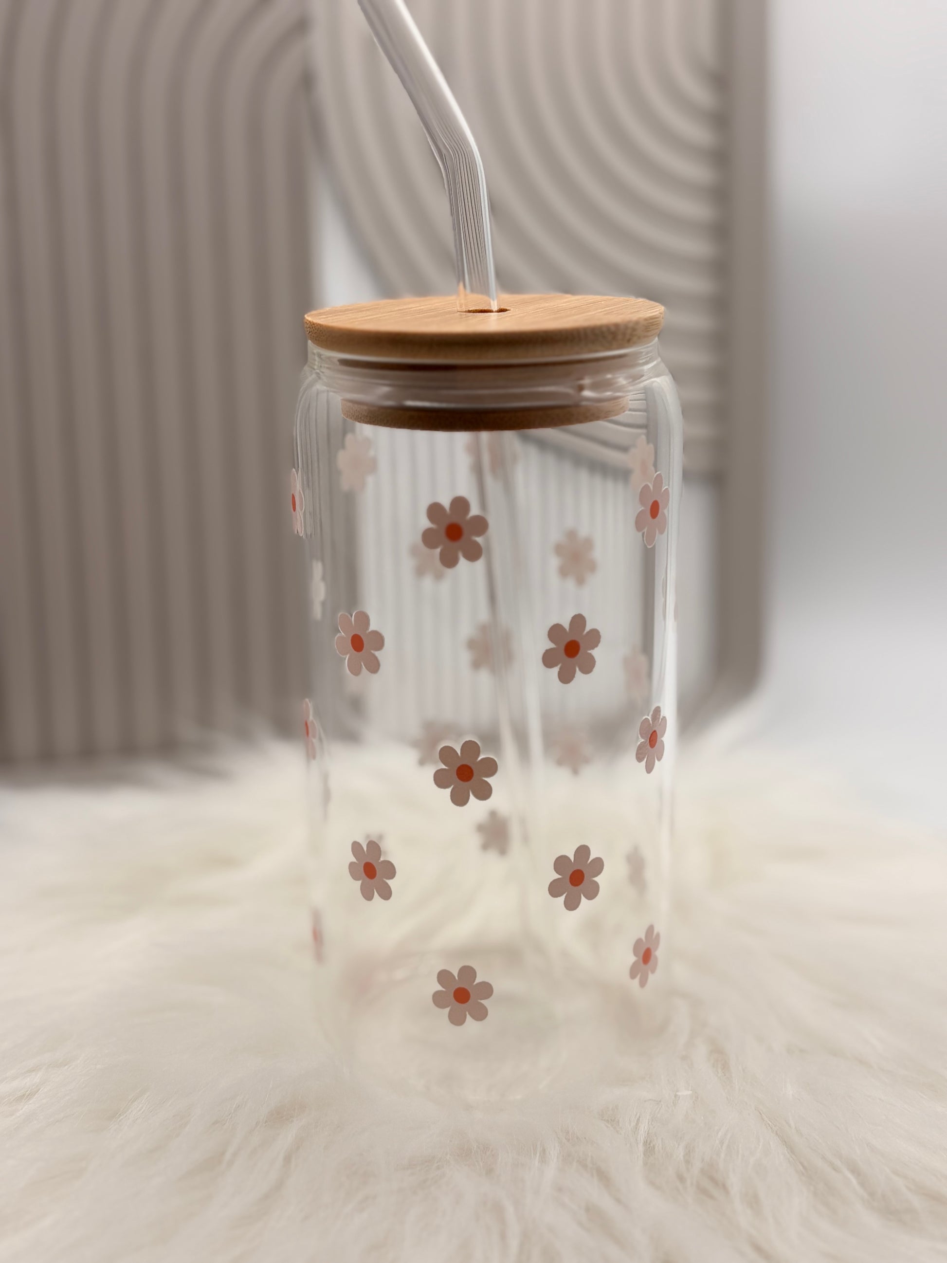 Trinkglas mit Deckel & Strohhalm - Gänseblümchen weiß