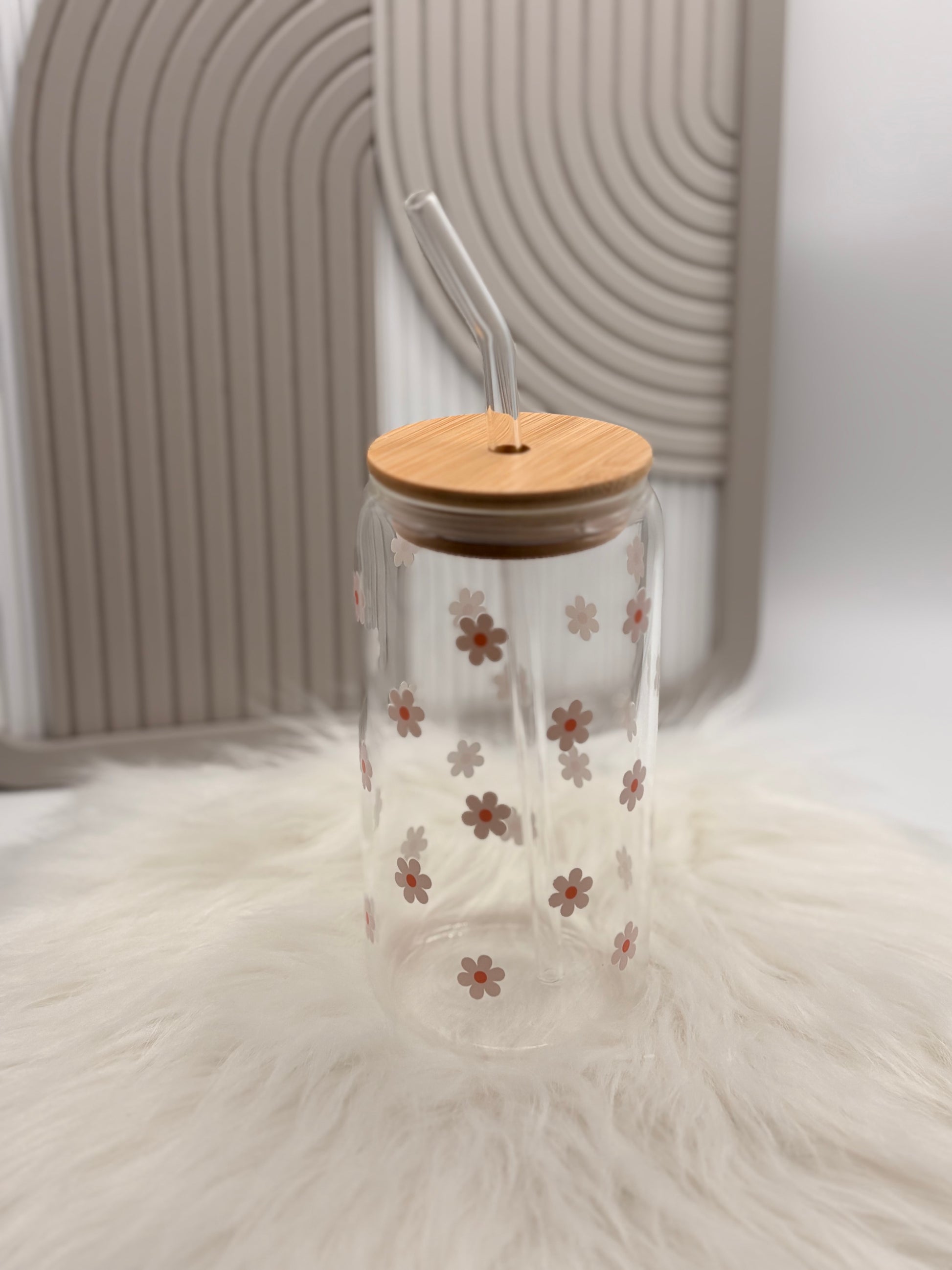 Trinkglas mit Bambusdeckel und Strohhalm mit weißen Gänseblümchen. Geeignet für warme und kalte Getränke.