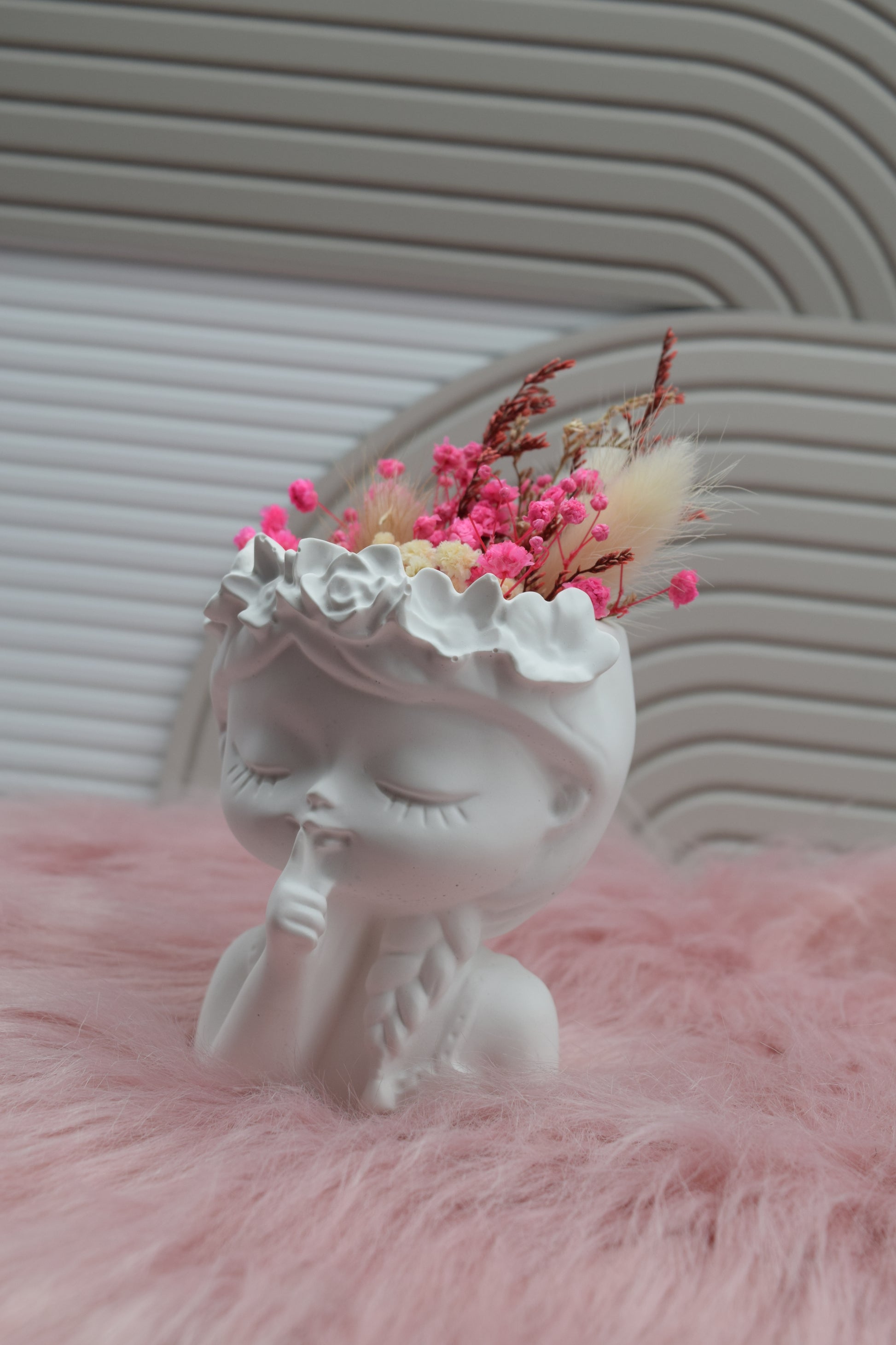 Verspielt, modern und liebevoll – Vase im Pssst-Mädchen-Design mit Trockenblumen.