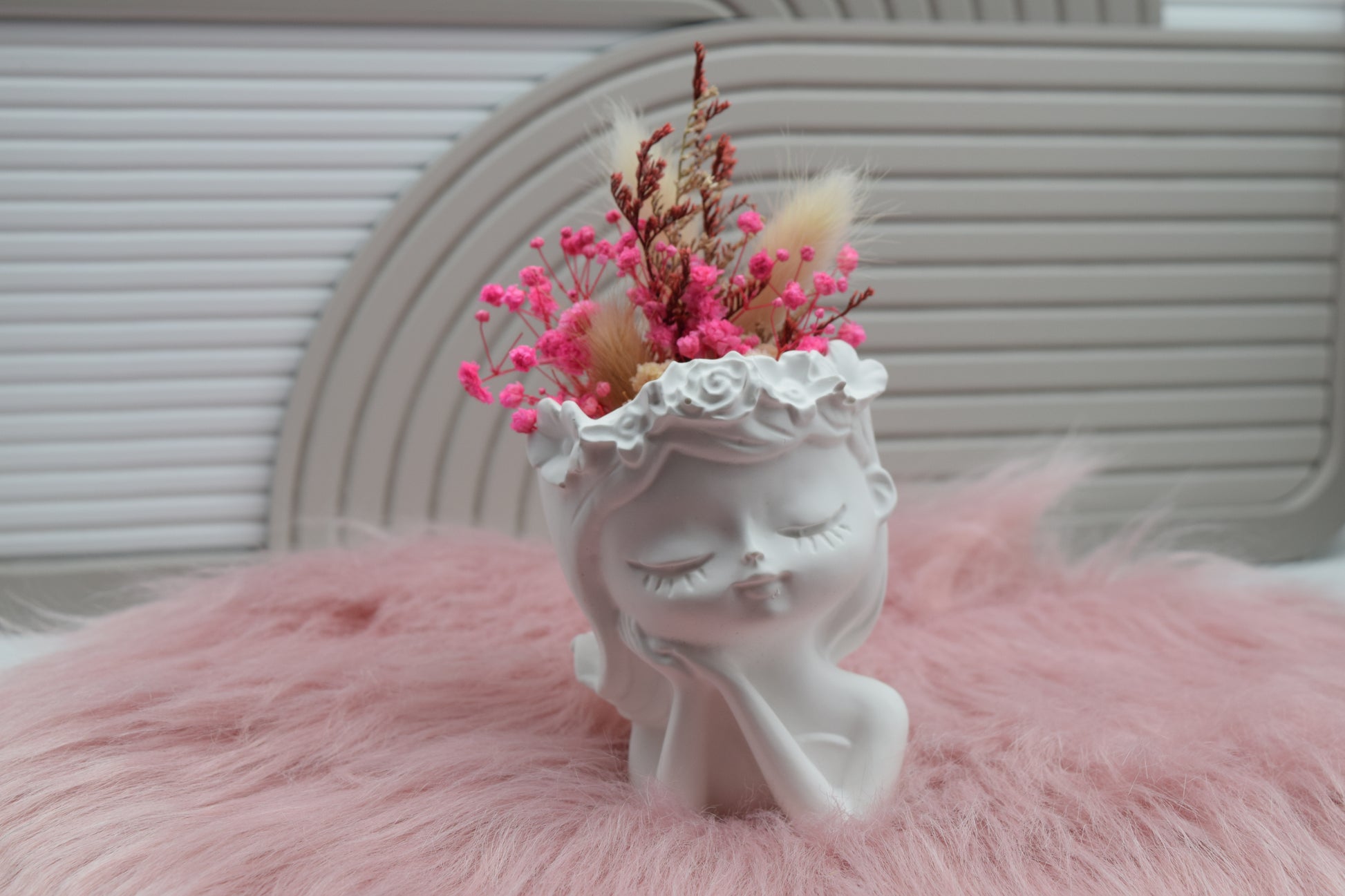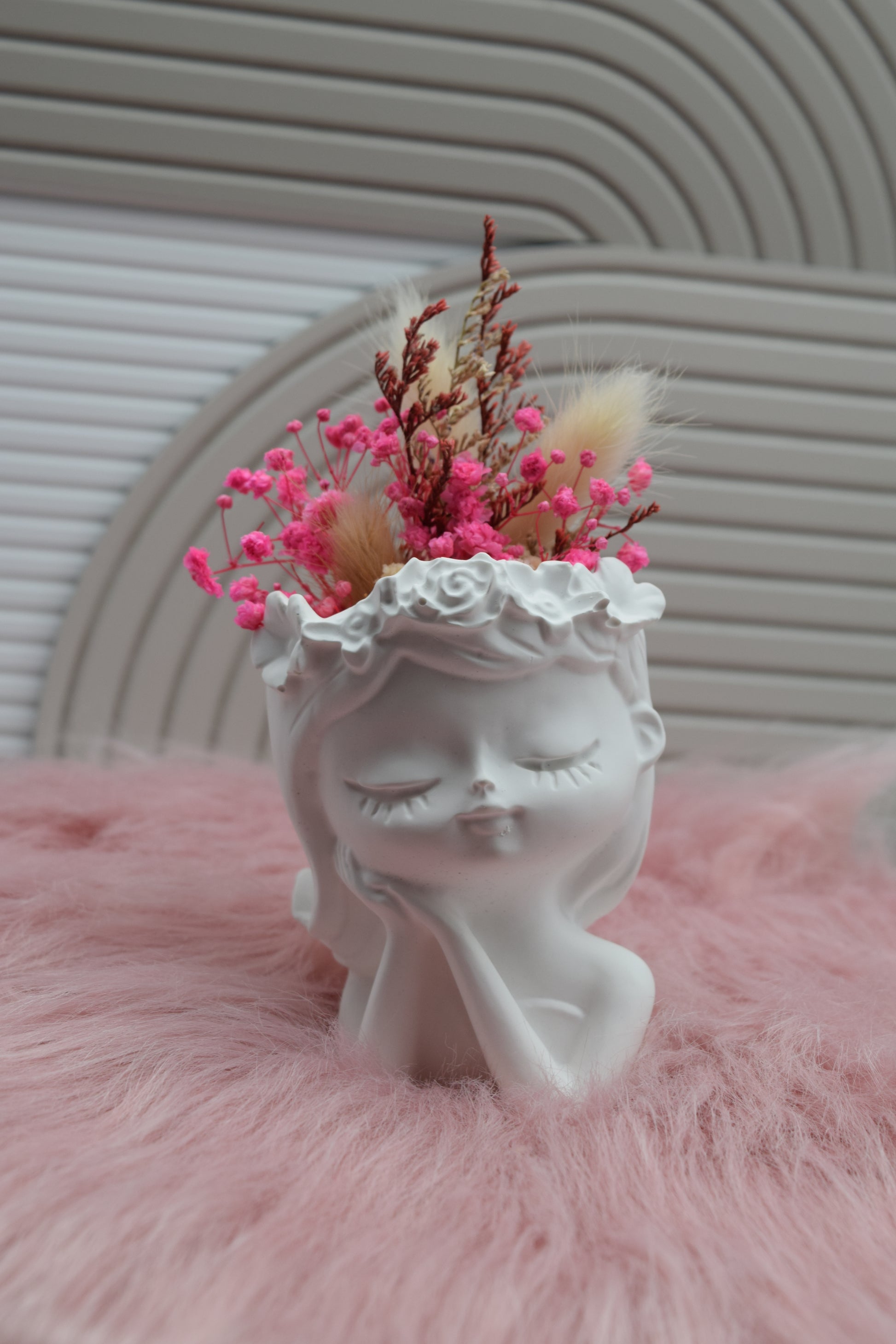 Zarte Eleganz in Handarbeit – Vase im träumenden Mädchenkopf-Design mit Trockenblumen.